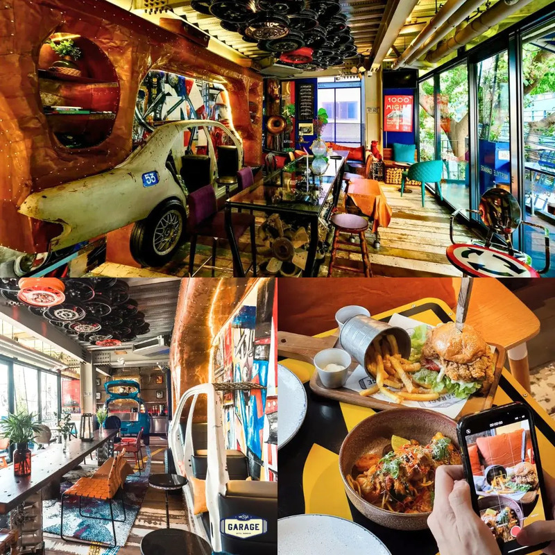 ร้านอาหารสุดชิคในโรงแรม MeStyle Garage Hotel Bangkok ย่านห้วยขวาง การตกแต่งของร้านเป็นสไตล์การาจ มีมุมถ่ายรูปเก๋ๆ เพียบเลยครับ เหมาะกับการนั่งชิล ภายในร้านมีที่จอดรถสะดวกสบาย เมนูอาหารมีทั้งอาหารไทยและอาหารนานาชาติ โดยเน้นเมนูสตรีทฟู้ดแบบฟิวชั่นที่ไม่เหมือนใคร ไม่ว่าจะเป็น เบอร์เกอร์ไก่ทอดกรอบ ข้าวผัดกุ้ง สปาเกตตี้ซีฟู้ดวอดก้า หรือของหวานอย่างช็อกโกแลตมิลค์เชคและวานิลลามอลต์ปั่น แต่ละจานเสิร์ฟมาสวยงาม ถ่ายรูปออกมาดูดีทุกรูปเลยครับ