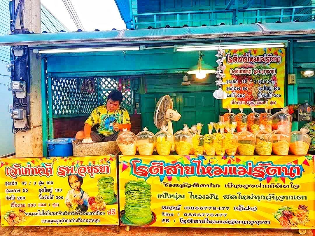 โรตีสายไหม แม่รัตนา อยุธยา โรตีสายไหมอยุธยาแม่รัตนา เปิดบริการทุกวัน เวลา 09:00–20:00 น. (ปิดทุกวันจันทร์) โรตีสายไหมแม่รัตนาใส่ใจในการทำเพื่อให้ได้แป้งนิ่ม มีทั้งแป้งขาว และแป้งใบเตย สายไหมหอม มัน สดใหม่ จำหน่ายทั้งปลีก-ส่งทางร้านมี 2 สาขา หน้าโรงพยาบาลพระนครศรีอยุธยา และตลาดเพื่อการเกษตร(ตลาดกลาง) Cr. ภาพทั้งหมดจาก Facebook โรตีสายไหม แม่รัตนา อยุธยา