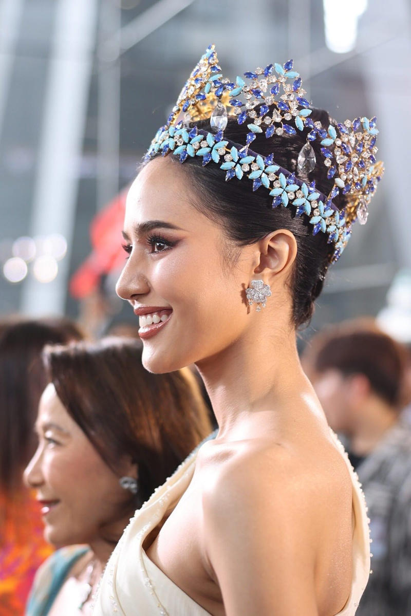 โดยบรรยากาศเวลา 13.30 น. โอปอล สุชาตา ปรากฏตัวพร้อมกับ จูเลีย มอร์ลีย์ ประธานองค์กรมิสเวิลด์ ท่ามกลางแฟนๆ ที่มารอต้อนรับอย่างอบอุ่น ซโดยเธอสวมชุดราตรีคัตติ้งไหล่เบี่ยงรับสายสะพาย ผลงาน custom made สุดเอ็กซ์คลูซีฟจาก SIRIVANNAVARI เนรมิตด้วยผ้ามัวเร่ (Moiré) อันหรูหราในโทนสีงาช้าง ประณีตด้วยเทคนิคงานจัปเดรปสไตล์กูตูร์และเพิ่มความโดดเด่นด้วยงานปักอันพิถีพิถันจาก SIRIVANNAVARI Atelier & Academy ที่เพิ่มมิติและความโดดเด่นให้กับชุดราตรีอันเป็นบทสรุปแห่งความงามสง่าและมาดมั่น ถ่ายทอดถึงปรัชญาในงานออกแบบแฟชั่นของแบรนด์ SIRIVANNAVARI ที่รังสรรค์อาภรณ์ที่เสริมความมาดมั่นให้กับสุภาพสตรี (Empowering Woman)
