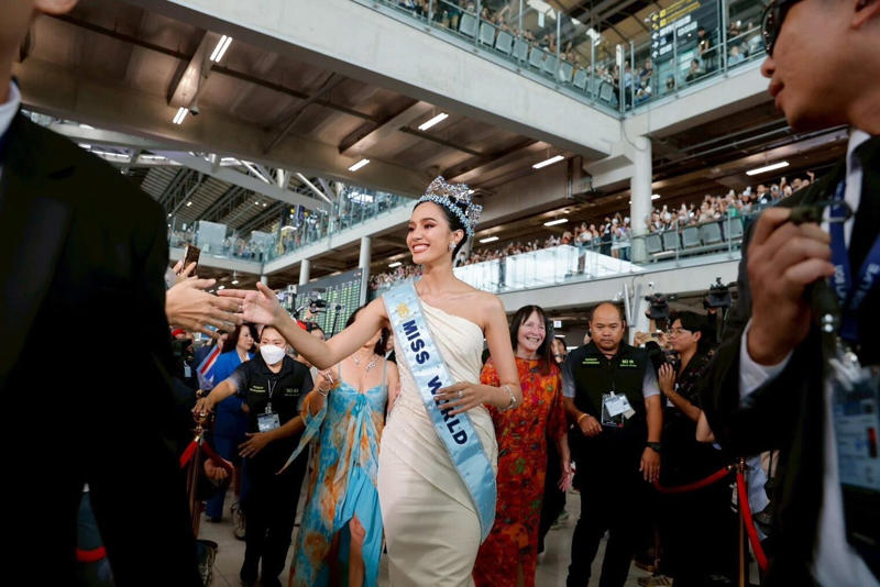 โอปอล มิสเวิลด์ 2025 ปรากฏตัวยิ่งใหญ่ แฟนนางงามน้ำตาคลอ รับแน่นสนามบิน