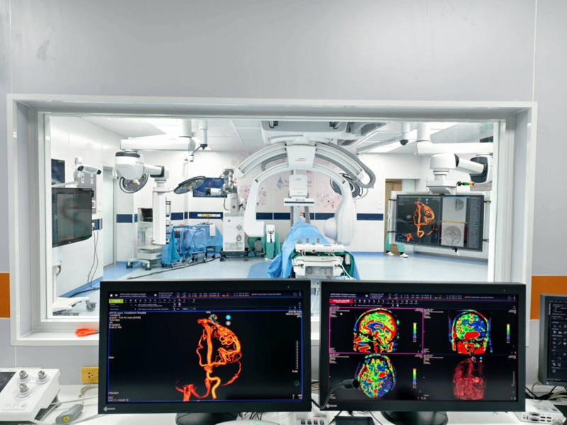 “เราสามารถตัดเส้นเลือดที่ไปเลี้ยงบริเวณเนื้องอกดังกล่าว และดำเนินการผ่าตัดนำเนื้องอกสมองออกได้ในคราวเดียวกัน ซึ่งมีประโยชน์ในการลดการเสียเลือดระหว่างผ่าตัด และได้รับการรักษาไปในครั้งเดียว หลังจากผ่าตัดเสร็จยังสามารถสวนหลอดเลือด เพื่อตรวจสอบว่าจัดการความผิดปกติออกได้ทั้งหมด 100% หรือไม่” 2.กล้องผ่าตัดกำลังขยายสูง เป็นรุ่นใหม่ล่าสุด ซึ่งเป็นเครื่องแรกของประเทศไทย สามารถใช้ในการผ่าตัดโรคทางสมองได้หลายประเภท โดยเฉพาะที่ต้องการความละเอียดสูงและหรือมีความซับซ้อนของกายวิภาคสูง 3.อุปกรณ์อื่นๆ ที่มีภายในห้องผ่าตัด อาทิ เครื่องตรวจวัดเส้นประสาทหรือระบบประสาท เครื่อง อัลตราซาวด์ที่ใช้ในการดูดสลายเนื้องอกหรือมะเร็งของสมอง เครื่องนำวิถี (เนวิเกเตอร์) สามารถช่วยในการระบุตำแหน่งของเนื้องอกสมองหรือรอยโรคทางระบบประสาทต่างๆ ได้อย่างแม่นยำ เปรียบเสมือน GPS ของรถยนต์ นอกจากนี้ยังมีอุปกรณ์สำหรับช่วยผ่าตัดอื่นๆ เพื่อให้ผู้ป่วยได้รับการรักษาที่ดีที่สุด