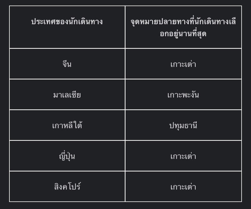อย่างไรก็ตาม ประเทศที่มีจำนวนนักเดินทางมาเยือนประเทศไทยมากที่สุด กลับไม่ใช่ประเทศที่นักเดินทางพำนักอยู่นานที่สุด โดยนักเดินทางจากจีนแม้จะครองอันดับหนึ่งในด้านจำนวนผู้มาเยือน แต่เมื่อพิจารณาระยะเวลาการเข้าพักเฉลี่ยแล้ว นักเดินทางจากเกาหลีใต้กลับใช้เวลาอยู่ในประเทศไทยนานที่สุด รองลงมาคือนักเดินทางจากญี่ปุ่น มาเลเซีย สิงคโปร์ และจีน ตามลำดับ