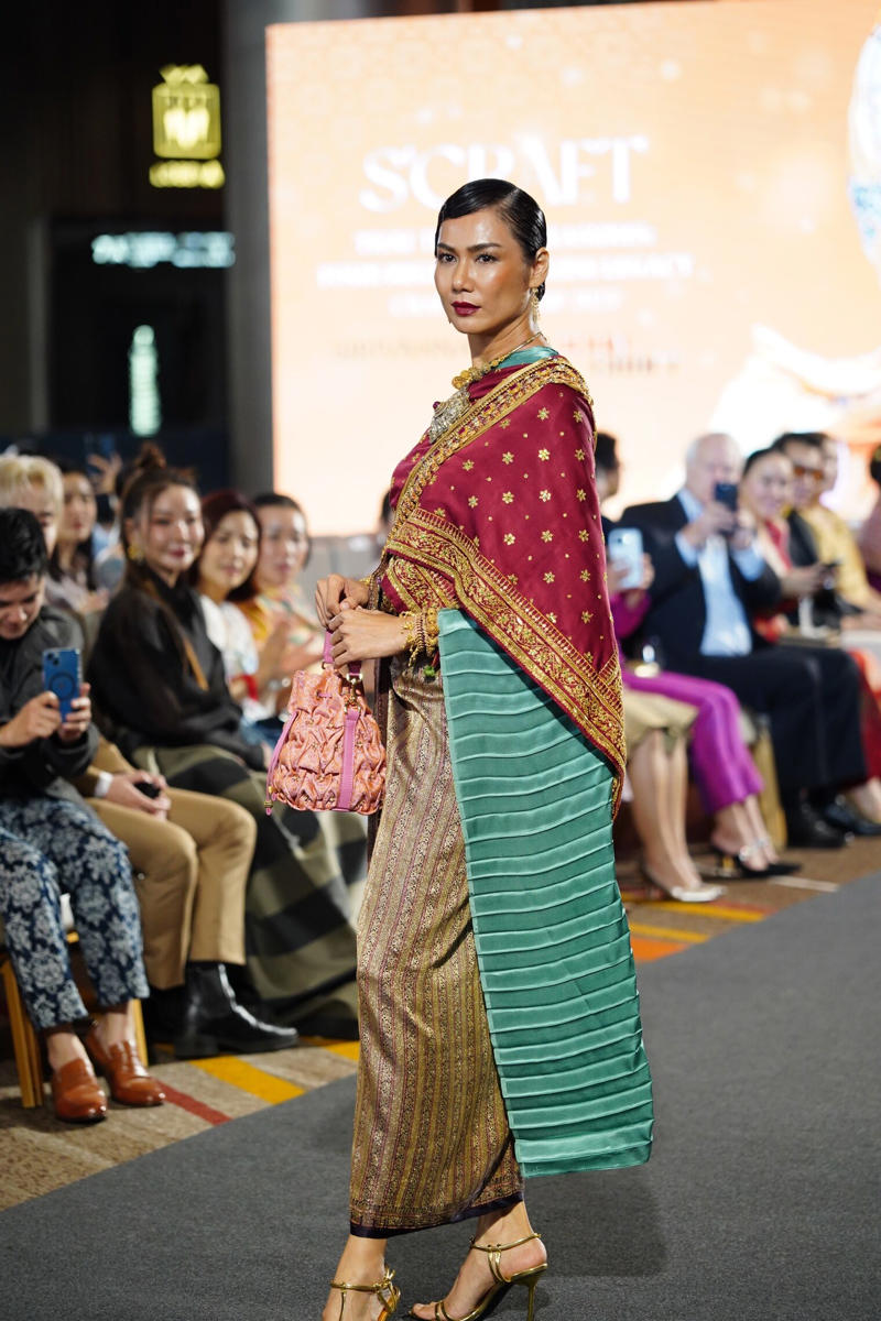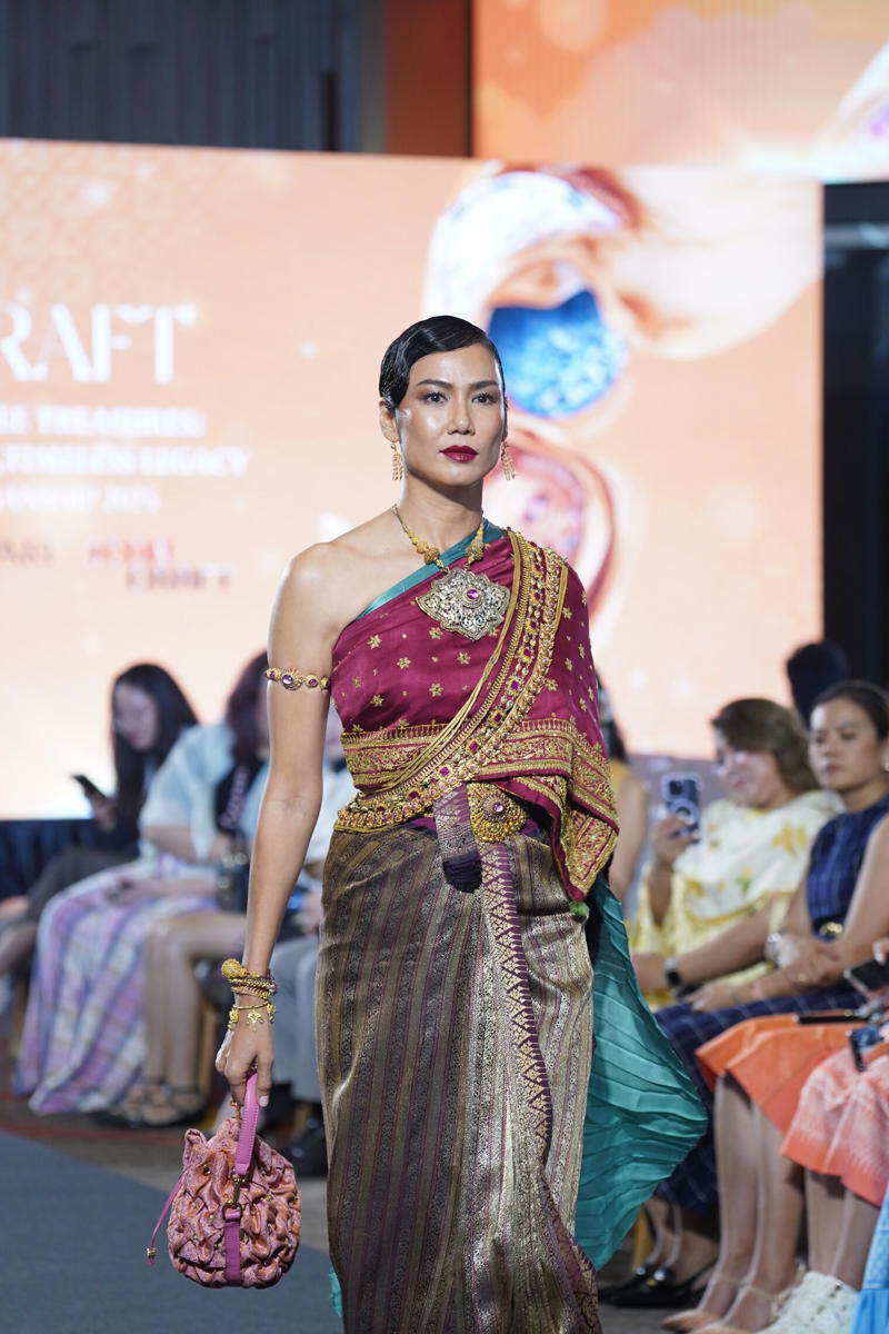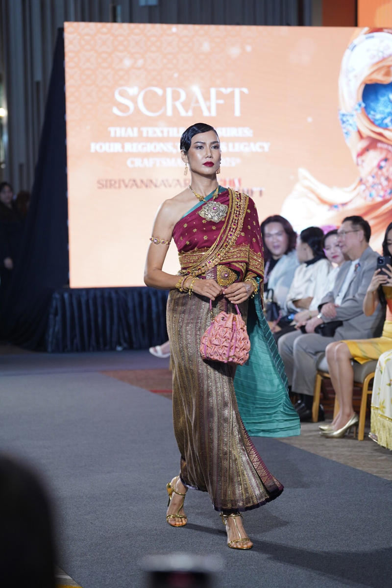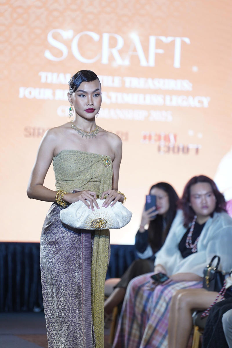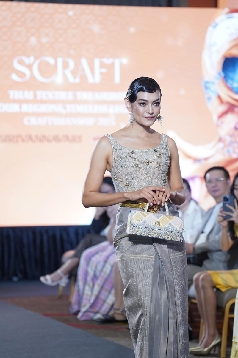 ผลงานไฮไลต์ที่นำเสนอผ่านแฟชั่นโชว์ “S’CRAFT THAI TEXTILE TREASURES: FOUR REGIONS, TIMELESS LEGACY CRAFTSMANSHIP 2025” คือ “Luxe de Siam Exclusive Edit Clutch” กระเป๋าคลัตช์ที่ตกแต่งด้วยสัญลักษณ์นกยูงรำแพนบนผ้าไหมผืนงามจากฝีมือ อาจารย์มีชัย แต้สุจริยา ศิลปินแห่งชาติ สาขาทัศนศิลป์ ผู้พัฒนาลวดลายอันเลื่องชื่ออย่างผ้ากาบบัว ซิ่นมุกจกดาว และก่อตั้งพิพิธภัณฑ์บ้านคำปุน ในจังหวัดอุบลราชธานี และอาจารย์วีรธรรม ตระกูลเงินไทย ครูศิลป์ของแผ่นดิน บรมครูผ้าไหมไทยผู้ก่อตั้งแบรนด์ “จันทร์โสมา” จากกลุ่มทอผ้ายกทองหมู่บ้านท่าสว่าง จังหวัดสุรินทร์