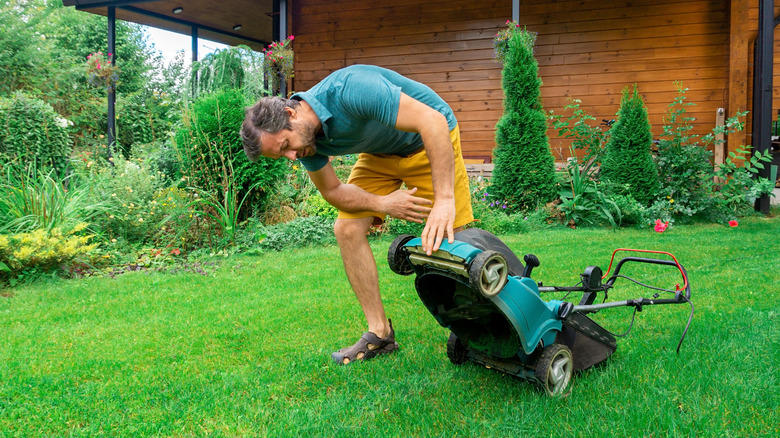 Person trying to figure out what's wrong with the lawn mower