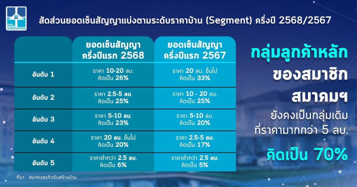 ส่วนสัดส่วนแบ่งตามระดับราคาบ้าน (Segment) ซึ่งมีการเก็บข้อมูลจากยอดเซ็นสัญญาของสมาชิกสมาคมฯ มีดังนี้