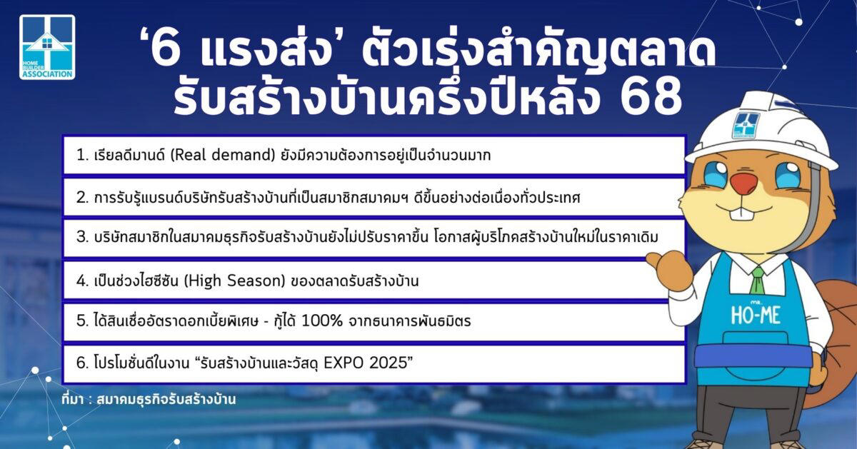 นอกจากนี้ยังมีอีก “6 แรงส่ง” ที่กระตุ้นให้ภาพรวมครึ่งปีหลัง 2568 เริ่มกลับมาคึกคักมากขึ้นทั้งในตลาดกรุงเทพฯ ปริมณฑล และต่างจังหวัด โดยเฉพาะตลาดต่างจังหวัด ได้แก่ ชลบุรี ระยอง นครราชสีมา เชียงใหม่ และภูเก็ต