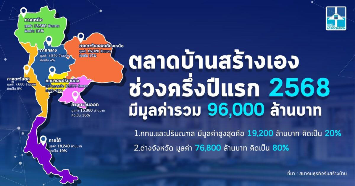 นายอนันต์กร อมรวาที นายกสมาคมธุรกิจรับสร้างบ้าน หรือ HBA (Home Builder Association) เปิดเผยว่า ตลาดบ้านสร้างเองครึ่งปีแรก 2568 มีมูลค่า 96,000 ล้านบาท แบ่งเป็นกรุงเทพฯ และปริมณฑล มีมูลค่าสูงสุด อันดับ 1 มูลค่า 19,200 ล้านบาท คิดเป็นสัดส่วน 20% ต่างจังหวัด มูลค่า 76,800 ล้านบาท สัดส่วน 80%