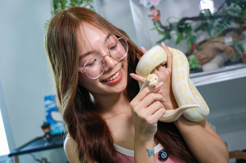 “เสน่ห์ของงูที่ต่างจากการเลี้ยงน้องหมาน้องแมวคือเราต้องคอยสังเกตเขาตลอดเวลา เพราะงูพูดไม่ได้ เห่าไม่ได้ เราจึงต้องคอยเฝ้าดูพฤติกรรมและอาการเขาว่าวันนี้เขามีอารมณ์แบบไหน กินอาหารยี่ห้อนี้แล้วดีไหม ไซส์ของหนูตัวเท่านี้พอดีกับเขาหรือเปล่า เป็นการค่อยๆ เรียนรู้เขาไปทุกวัน หนูว่ามันก็เป็นเสน่ห์อย่างหนึ่งค่ะ”