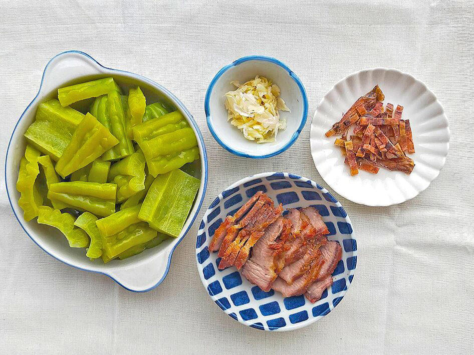 ของแบบนี้ท้าทายดีครับ ดังนั้นผมลองทำตามสูตรนี้ของท่าน ม.ล.หญิงติ๋ว โดยผ่าผลมะระจีนเป็นสี่เสี้ยว ขูดไส้ขูดเมล็ดออก หั่นเป็นชิ้น แล้ว “น้ำใส่หม้อประมาณ 4 ถ้วย เกลือ 1 ช้อนคาว ตั้งไฟพอเดือด ใส่มะระลงต้มประมาณ 5 นาที รินน้ำออกทิ้ง ใส่น้ำเย็นแช่ไว้” ส่วนหมูนั้น “เลือกหมูย่างที่มันไม่มากนัก หั่นติดทั้งหนังด้วย ตวงประมาณ 1 ถ้วย” ของอย่างอื่นก็มีหมึกแห้งหั่นขวาง น้ำปลา น้ำตาลทราย กระเทียมเจียว