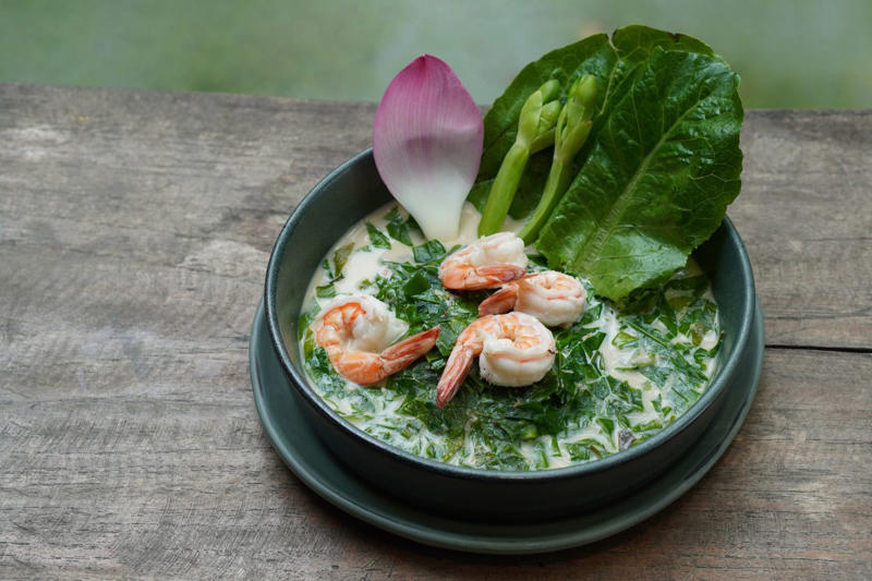 เมนูน้ำกะทิรสชาติเข้มข้น หอมมัน กลมกล่อม ใส่ใบเหลียงอ่อน ๆ กับกุ้งสดหรือกุ้งแห้ง มักจะปรุงรสให้มีรสเค็มหวานนำ สามารถใส่ลูกเหลียงต้มเพิ่มลงไปได้ เป็นแกงที่รับประทานคู่กับข้าวสวยร้อน ๆ แล้วเข้ากันอย่างลงตัว