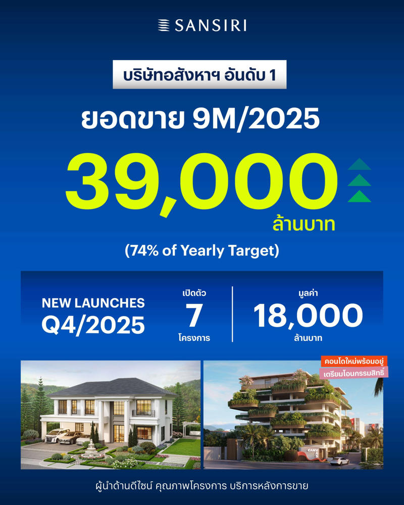 นายวิชาญ วิริยะภูษิต ประธานผู้บริหารสายงานการเงิน บริษัท แสนสิริ จำกัด (มหาชน) หรือ SIRI เปิดเผยว่า อัพเดตยอดขาย 9 เดือนแรก (มกราคม-กันยายน 2568) บริษัทสามารถทำยอดขายได้ตามแผนงานที่ 39,000 ล้านบาท คิดเป็น 74% ของเป้ายอดขายรวมในปี 2568 ที่ตั้งไว้ 53,000 ล้านบาท