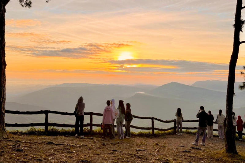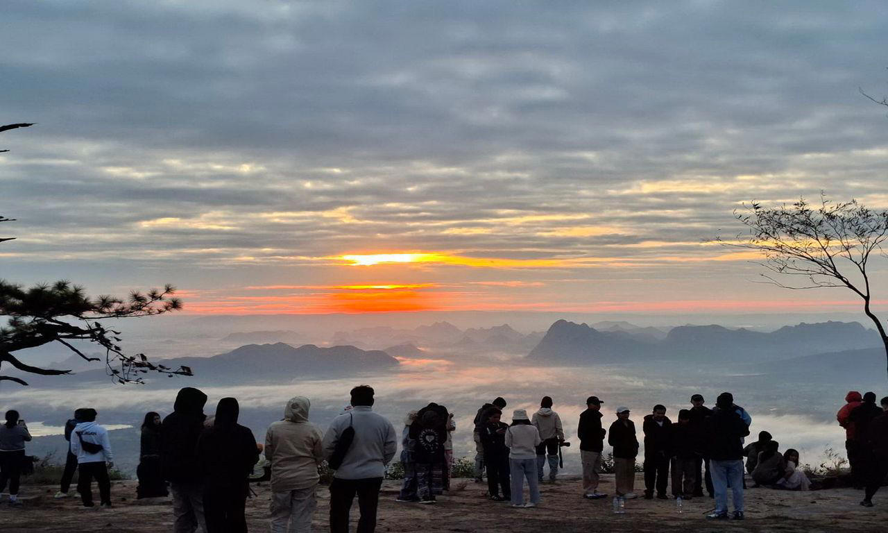 บนภูกระดึง อุณหภูมิราว 15 องศา นักเดินเขากว่า 1,000 ชีวิตมุ่งหน้าไปผานกแอ่น จับจังหวะพระอาทิตย์ทะลุชั้นหมอกหนา เห็นแนวสนเรียงชั้นเป็นฉากหลัง ชั่ววินาทีที่ทำให้หลายคนเผลอยกกล้องขึ้นรัวชัตเตอร์ ผู้ที่กางเต็นท์ค้างคืนบนยอดภูราว 500 คนตื่นกันก่อนฟ้าเริ่มสว่าง เพื่อเก็บภาพเช้าแรกของซีซัน ขณะที่เจ้าหน้าที่อุทยานคอยดูแลเส้นทางเปิด–ปิดและอำนวยความสะดวกตลอดแนว