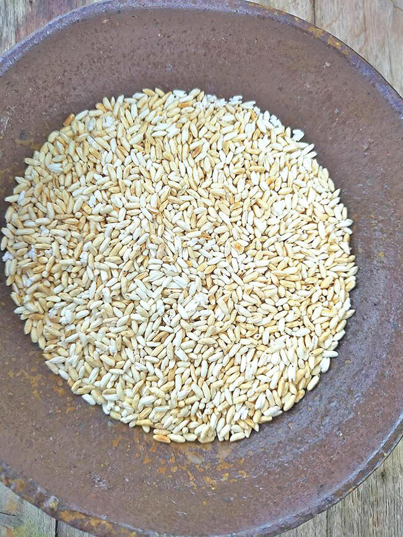 แช่เมอคือการต้มข้าวเหนียวคั่วตำจนเนื้อละเอียดนุ่มเละ ผสมกับผักสะระแหน่น้ำ ผักสำคัญของคนอาข่าป่าเกี๊ยะ ปรุงด้วยเกลือและกระเทียมเจียวเพียงเท่านั้น ความที่ติดใจรสชาติอันเค็มนัวนวลอ่อนโยนของมัน ผมลองเอาสูตรนี้กลับมาปรุงกินที่บ้าน โดยปราศจากผักสะระแหน่น้ำ แต่อาศัยผสม (blend) รสและกลิ่นของผักท้องถิ่นพื้นราบทดแทนผมคั่วข้าวเหนียวในกระทะบนเตาไฟอ่อน ไม่ต้องให้เกรียมไหม้มากนะครับ แค่พอเมล็ดข้าวเปลี่ยนเป็นสีเหลืองอ่อนๆ แบบที่อาปิทำ แล้วตำในครกหินจนละเอียด ทำกระเทียมเจียวเตรียมไว้ 1 ถ้วยเล็ก ส่วนเกลือป่นนั้น ผมมีเกลือบ่อโพธิ์จากหุบเขาเมืองนครไทยติดครัวอยู่แล้ว