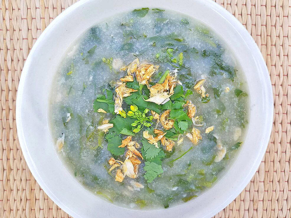 สำหรับผักสด ผมใช้แค่สามสี่อย่าง มียอดตำลึง ผักกวางตุ้ง ขึ้นฉ่าย อ่อมแซบ แต่งกลิ่นหอมซ่าด้วยใบเนียมหูเสือนิดหน่อย ผักเหล่านี้ เราเด็ดล้าง หั่นซอยไว้เมื่อจะทำ ผมตั้งหม้อน้ำบนเตาไฟ เติมเกลือป่น ใส่ผักในสัดส่วนพอเหมาะที่อยากจะกินนะครับ เคี่ยวไฟอ่อนไปสักครู่ จนผักเริ่มสุก ทีนี้ทยอยใส่ข้าวเหนียวคั่วป่นนั้นโรยลงคราวละทัพพี คอยคนเร็วๆ อย่าให้ติดก้นหม้อหรือจับตัวกันเป็นลูก ใส่เพิ่มไปเรื่อยๆ จนรู้สึกว่าเนื้อข้าวต้มในหม้อข้นพอดีๆ กับชิ้นผัก ชิมรสให้เค็มอ่อนๆ ก็ใช้ได้ครับ