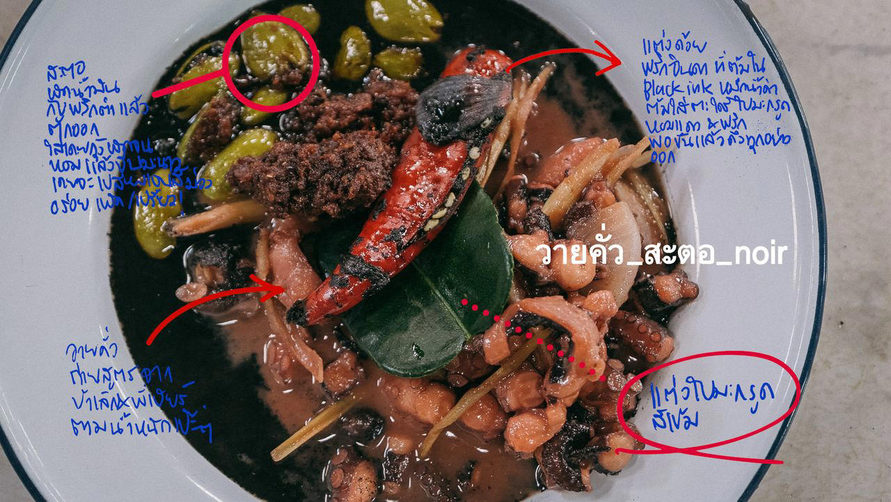 เมนู “วายคั่วสะตอ Noir” (วายคั่ว-สะตอ-นัว) เป็นการนำ “วาย” หรือปลาหมึกสาย ที่สามารถจับได้ตามโขดหินในฤดูน้ำแห้ง มาปรุงคู่กับ “เคยจี่” ซึ่งเป็นกะปิท้องถิ่นของเกาะสมุย แล้วใช้สะตอของเกาะสมุยที่เม็ดใหญ่รสชาติหอม มัน นัว มาเป็นวัตถุดิบหลัก และเพิ่มความพิเศษด้วย “หมึกดำ” ที่คนท้องถิ่นมักจะทิ้งไป แต่คุณแจะนำมาทำให้สุกแล้วผัดกับเครื่องเทศตามสไตล์อาหารอิตาเลียน (จึงเป็นที่มาของคำว่า “Noir” ที่แปลว่าสีดำในภาษาฝรั่งเศส) แล้วรับประทานคู่กับข้าวมันมะพร้าว ซึ่งเป็นอีกหนึ่งอาหารท้องถิ่นของเกาะสมุยด้วยเช่นกัน เมื่อนำมาคลุกเคล้ากินเข้าด้วยกันทำให้มีรสชาติหวานมันเค็มนัวลงตัวครบรสอร่อยที่แปลกใหม่ไม่ซ้ำใคร