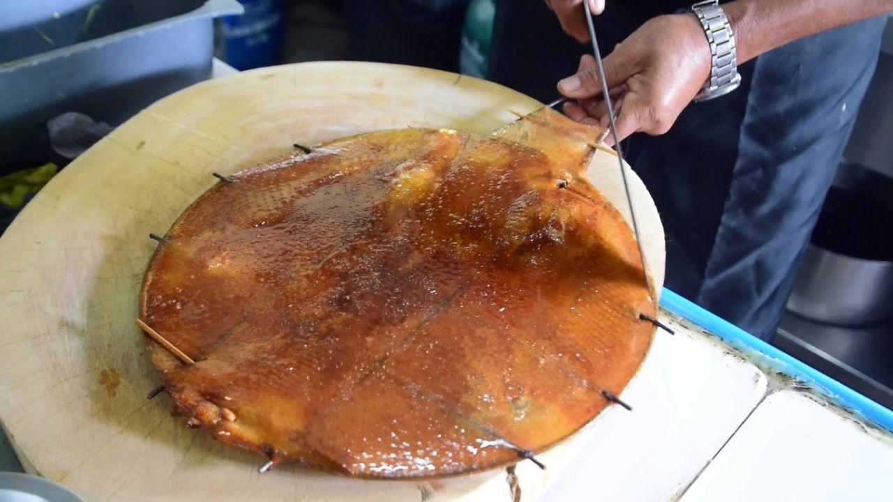 วิเชียร จีนมหันต์ วัย 68 ปี เจ้าของร้าน ไม่รอช้าสาธิตการทำเมนูเด็ดประจำร้าน คือ “เป็ดปักกิ่ง” ด้วยความใจเย็นและพิถีพิถัน เคล็ดลับความกรอบของหนังเป็ดอยู่ที่การค่อย ๆ ราดน้ำมันลงบนหนังเป็ดอย่างต่อเนื่อง นานถึง 15-20 นาที เพื่อให้ได้หนังเป็ดที่บางกรอบ เป็นเอกลักษณ์เฉพาะตัว