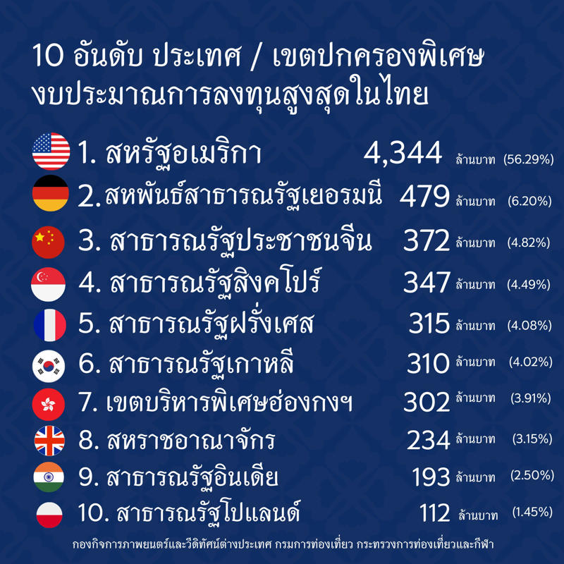 ขณะที่ประเทศที่มีงบประมาณการลงทุนสูงสุด คือ สหรัฐอเมริกา 4,344 ล้านบาท ตามมาด้วย เยอรมนี 479 ล้านบาท และจีน 372 ล้านบาท