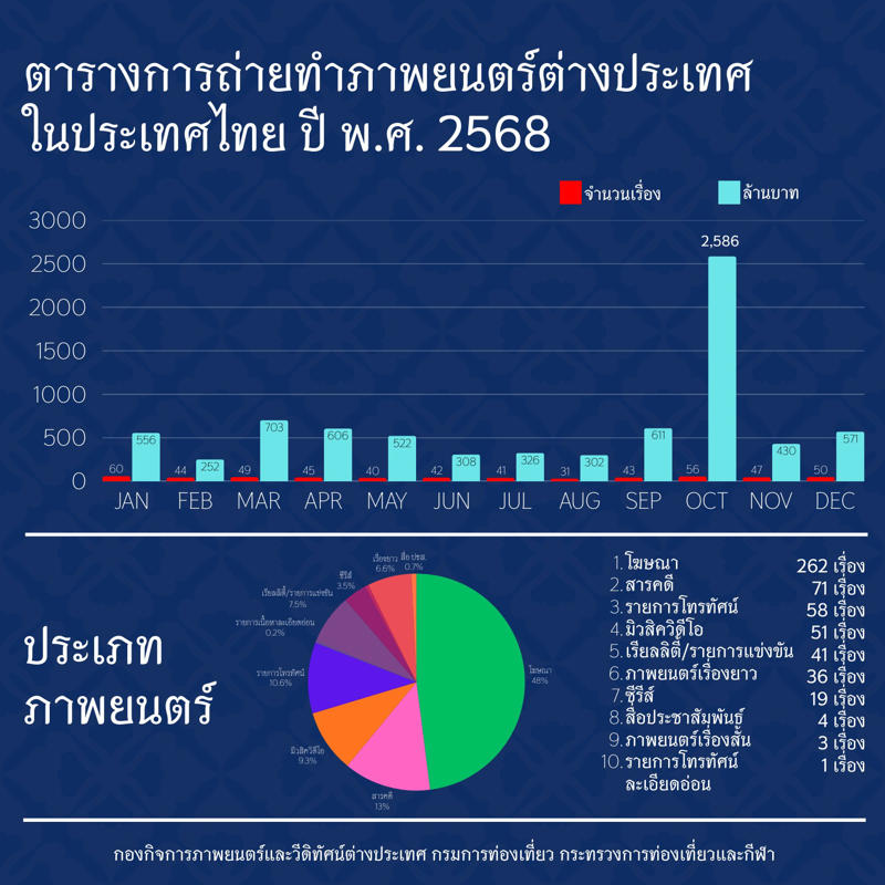 ผู้สื่อข่าวรายงานเพิ่มเติมว่า จากข้อมูลที่มีการเปิดเผย พบว่ามีการถ่ายทำมากที่สุดในช่วงเดือนมกราคม 2568 ถึง 60 เรื่อง แต่มีเงินลงทุนมากที่สุดในช่วงเดือนตุลาคม 2568 มากถึง 2,586 ล้านบาท และประเภทภาพยนตร์ส่วนใหญ่ ยังคงเป็นภาพยนตร์โฆษณา มากถึง 262 เรื่อง