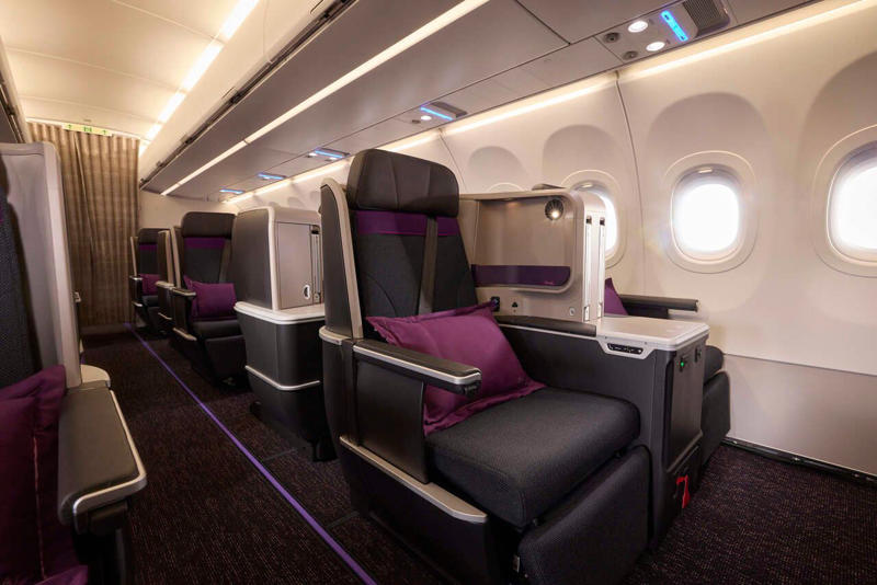 ไฮไลต์แรกที่สะดุดตาคือรูปลักษณ์ภายนอกที่ฉีกกฎเดิมๆ ด้วยโทนสี Neon Violet สะท้อนความทันสมัยแฝงกลิ่นอาย Thai Contemporary ที่ดูโฉบเฉี่ยวขึ้นอย่างชัดเจน พร้อมสัญลักษณ์ A321neo ดีไซน์พิเศษที่บ่งบอกถึงนวัตกรรมแห่งอนาคต