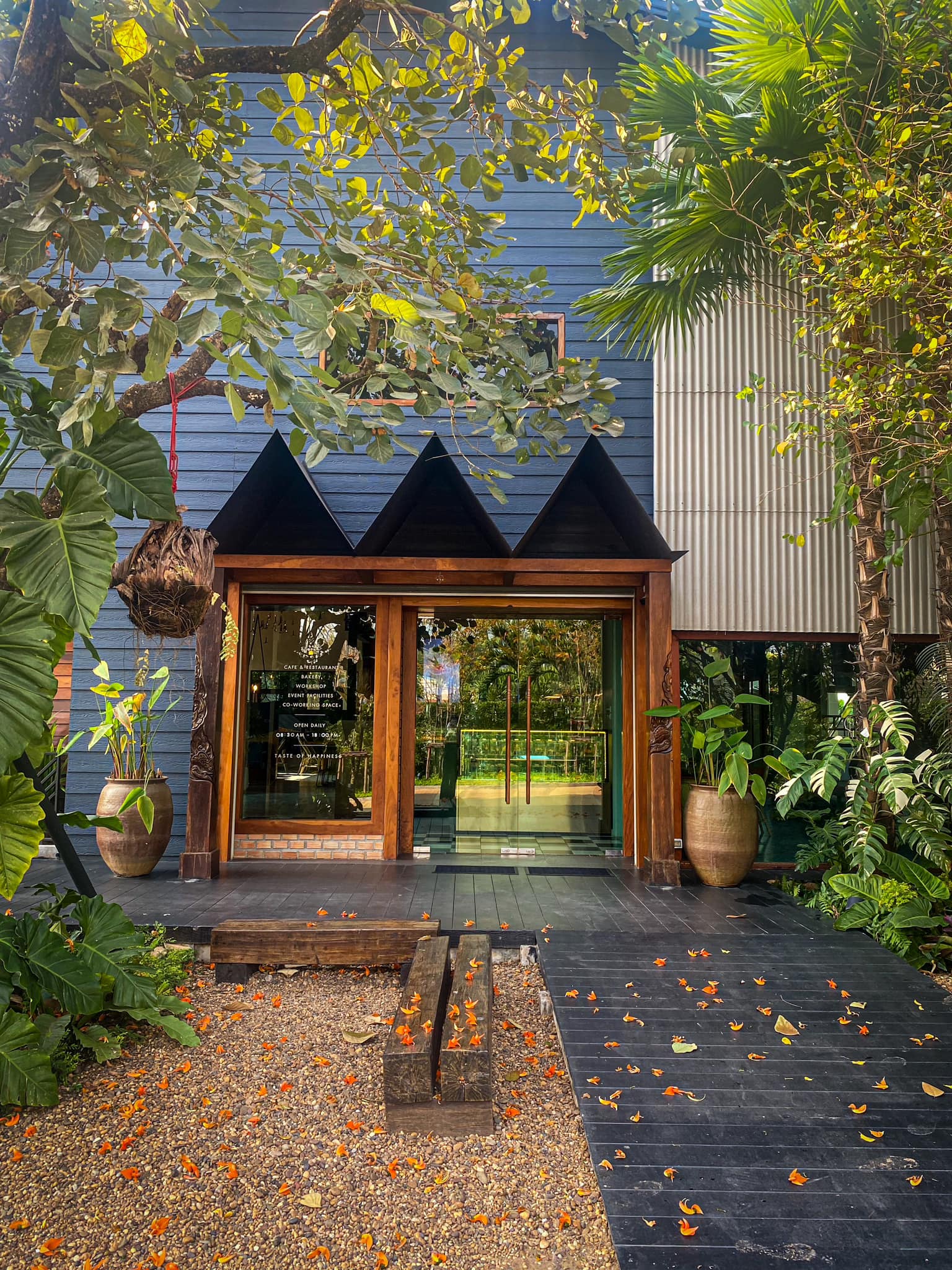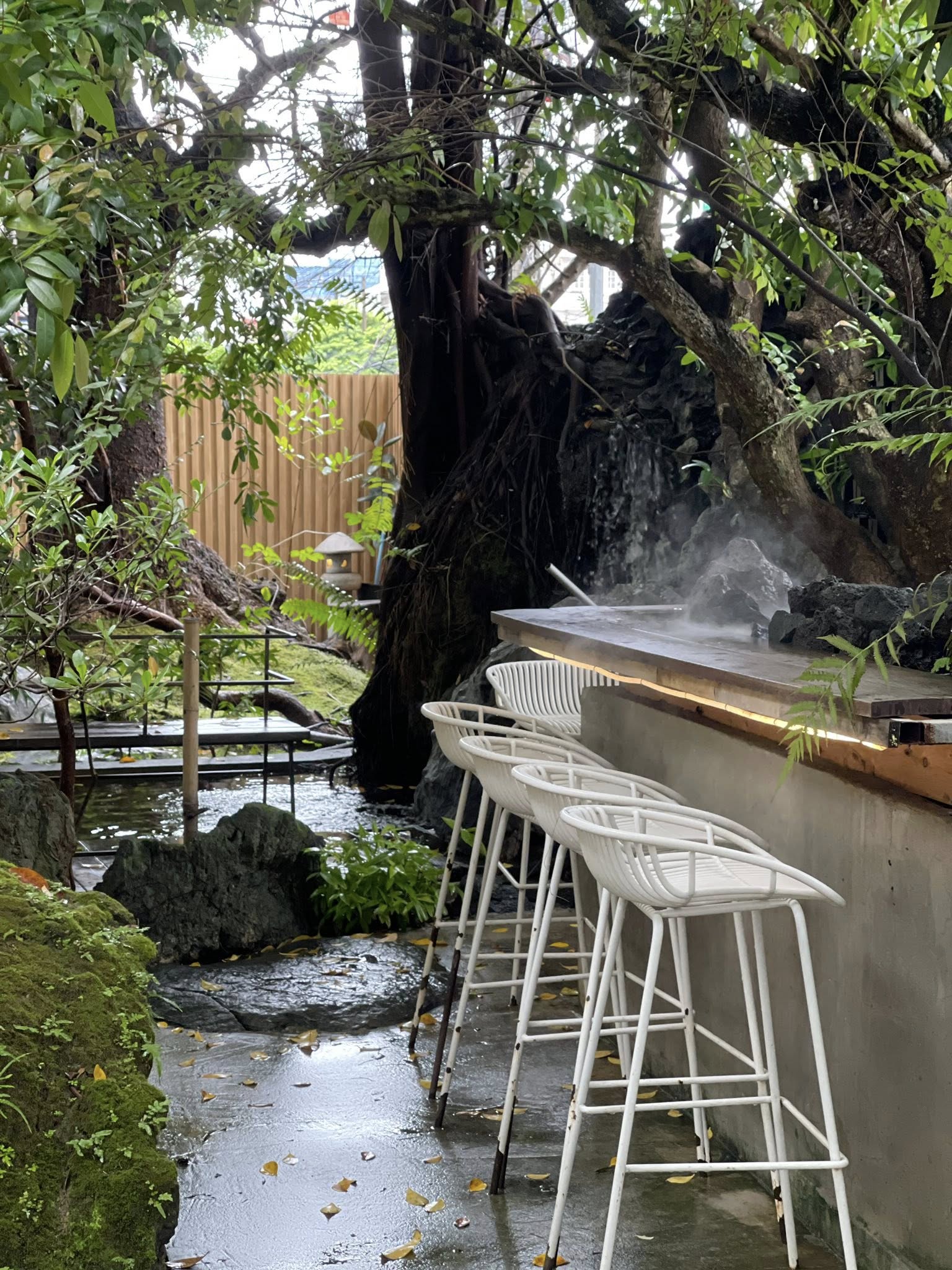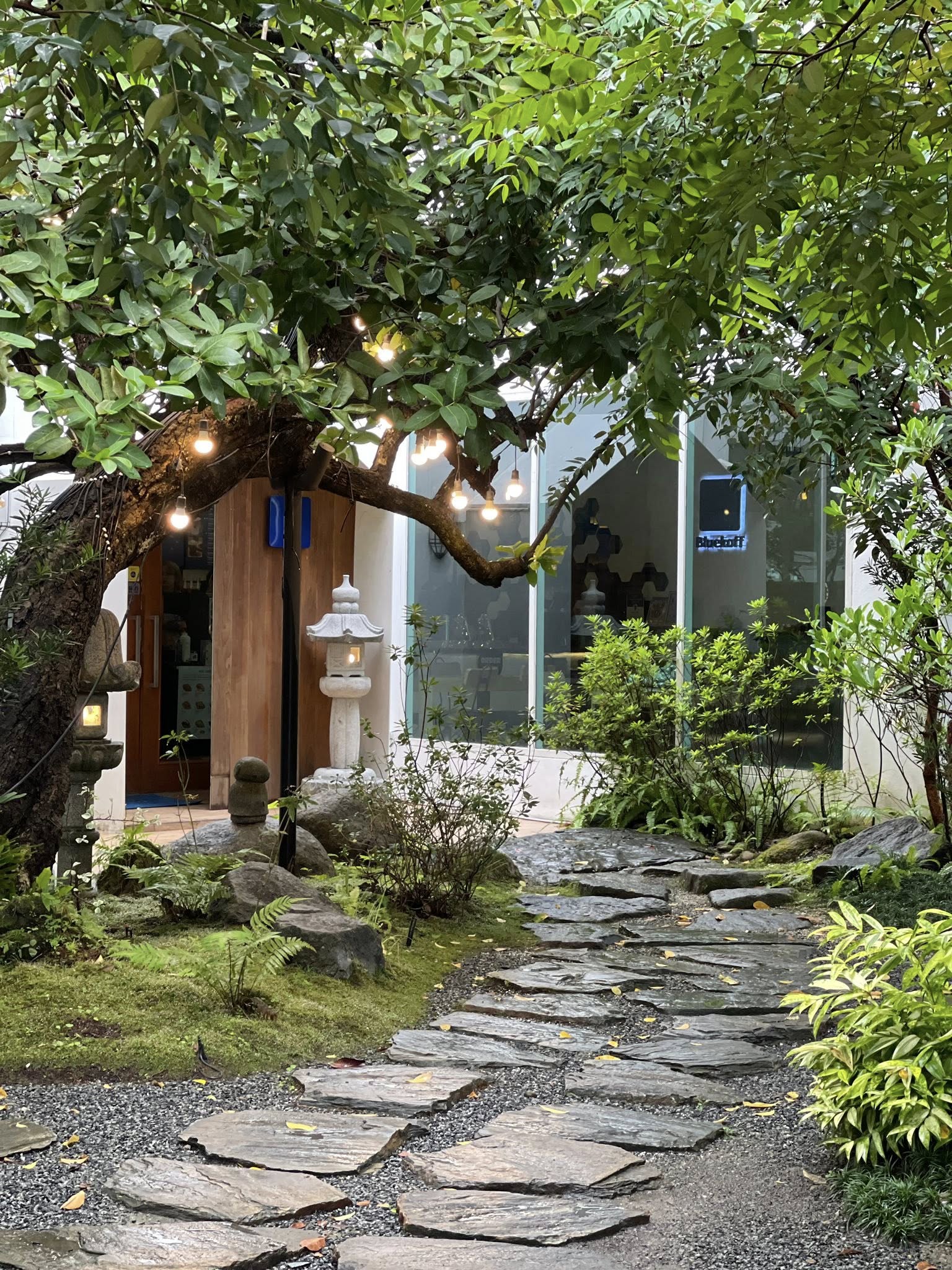 ร้าน Bluekoff Udon เปิดบริการทุกวัน คาเฟ่และร้านอาหารเปิด 08:00 - 17:00 ถ้ากำลังมองหาคาเฟ่เครื่องดื่ม แต่ให้ “ประสบการณ์” ตั้งแต่ก้าวแรกที่เดินเข้าไป Bluekoff Udon คือหนึ่งในร้านที่ควรปักหมุดไว้ทันที ที่นี่ไม่ใช่คาเฟ่ทั่วไป แต่เป็นพื้นที่สีเขียวที่โอบล้อมด้วยสวนสไตล์ญี่ปุ่น ต้นไม้ใหญ่ ทางเดินหิน โคมไฟหิน และเสียงน้ำเบาๆ ที่ช่วยตัดความวุ่นวายออกจากเมืองได้อย่างน่าประหลาด แค่เดินเข้ามา ความรู้สึกก็เหมือนได้หลุดไปอยู่ในสวนเงียบสงบ somewhere in Japan ไม่ว่าจะเป็นโซนที่นั่งใต้ต้นไม้ใหญ่ เคาน์เตอร์บาร์ริมสวนที่มีไอหมอกลอยเบาๆ หรือมุมโต๊ะไม้ที่มองเห็นสวนหินและโคมไฟญี่ปุ่น ทุกมุมให้ความรู้สึกผ่อนคลาย เหมาะทั้งกับการมานั่งชิล อ่านหนังสือ ทำงาน หรือ แค่อยากพักใจ และเงียบสงบ Cr. ภาพทั้งหมดจาก Facebook Bluekoff UdonBluekoff Udon